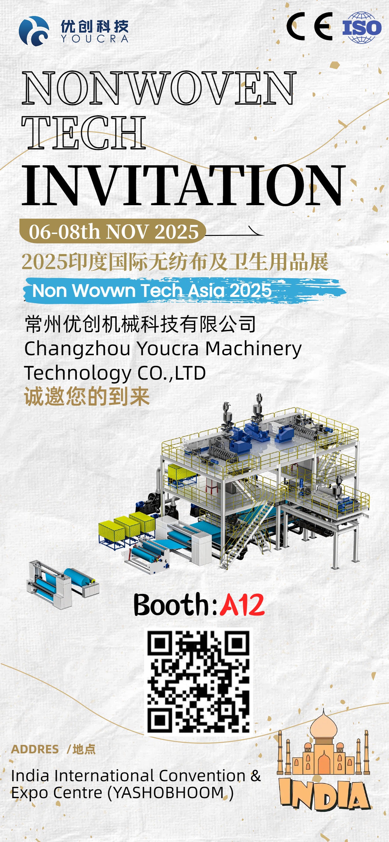 We are delighted to announce that Changzhou Youcra Machinery Technology Co., Ltd. will make a remarkable appearance at the 2025 India International Nonwoven and Hygiene Products Exhibition! This year’s event will be held grandly from November 6 to 8, 2025, in New Delhi, India.
